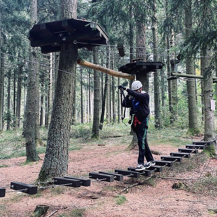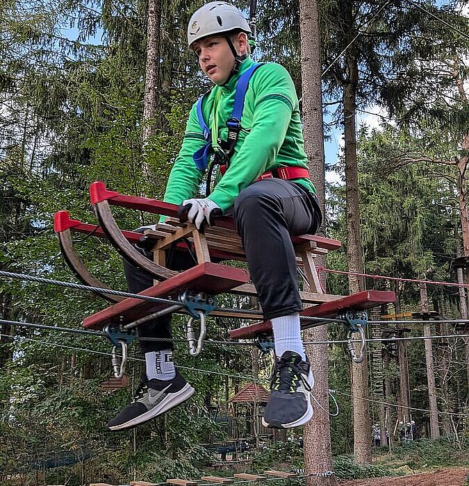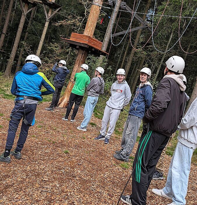 Grenzen überwinden und Gruppendynamik stärken - das Motto vom Kennenlerntag der 1AHIT am 29.9. im Hochseilgarten in Kirchschlag. Die gruppendynamischen Übungen - einen Turm zu bauen und einem Partner blind zu vertrauen - absolvierte die Klasse in zwei Gruppen. Danach konnten sich die Schüler bei einer Pizza stärken. Anschließend war die Einführung ins Sicherungssystem für den Hochseilgarten. Daraufhin durften sich die Schüler im Hochseilgarten bei den verschiedenen Parcours bewähren.