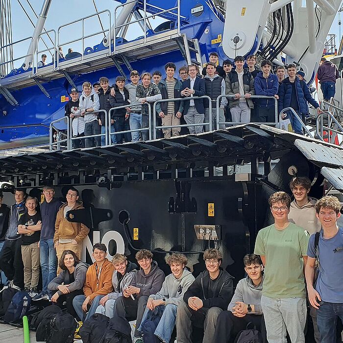 Ein besonderes Highlight war der riesige Bagger von Komatsu, der mit seiner gewaltigen Größe und modernsten Steuerungstechnik beeindruckte. Ebenso faszinierend war ein großer weißer Kran, der über das Messegelände hinausragte, wo wir auch ein Gruppenfoto machten.