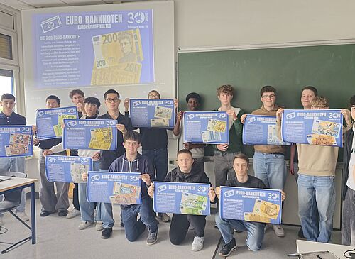 Im Mittelpunkt stand die künstlerische und kreative Auseinandersetzung mit der geplanten Neugestaltung der Euro-Banknoten. Mithilfe von KI-gestützten Anwendungen und Grafikprogrammen entwickelten die Schülerinnen und Schüler eigene Entwürfe, die Aspekte von Kultur, Natur und europäischer Identität thematisieren.
