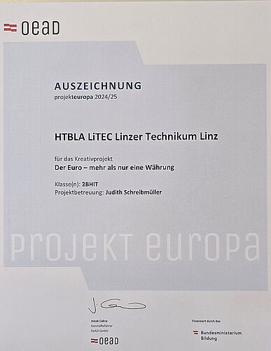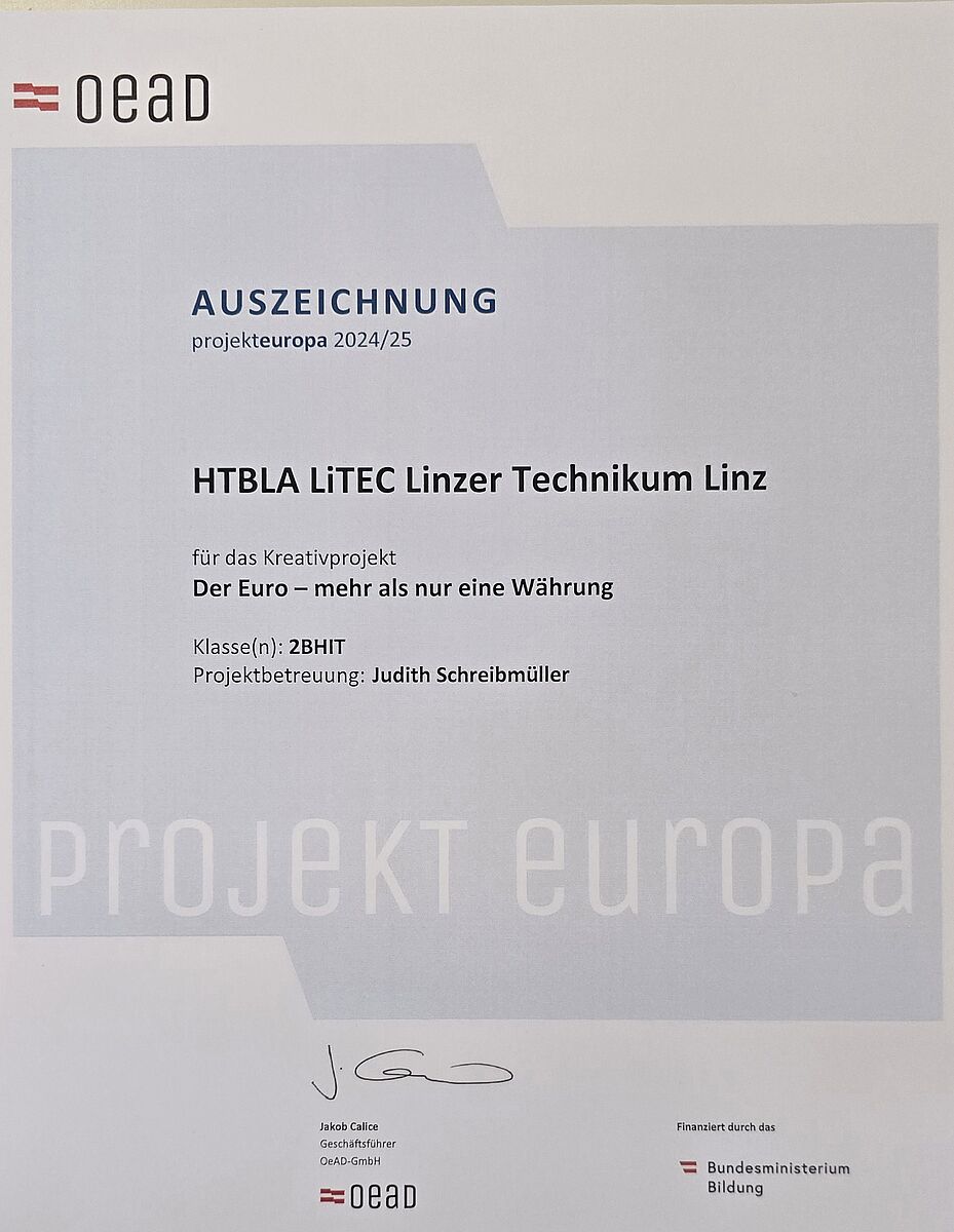 Unter dem Jahresthema „Sternmomente – Europa kreativ“ reichten österreichweit 4.681 Schülerinnen und Schüler ihre Projekte ein. Aus 147 eingereichten Beiträgen wurden 70 ausgezeichnet – darunter auch das Projekt der 3BHIT mit dem Titel „Der Euro – mehr als nur eine Währung“, das in Kooperation mit der Österreichischen Nationalbank entstand.