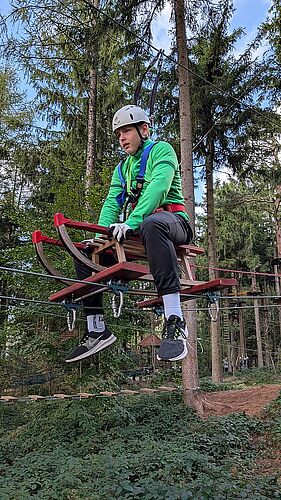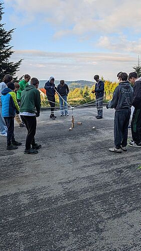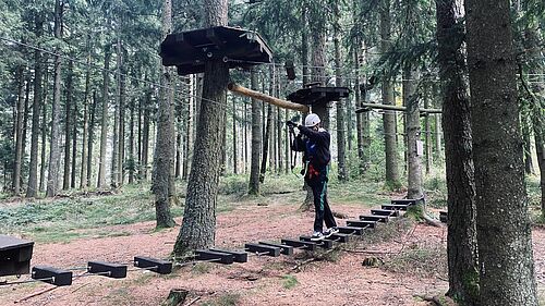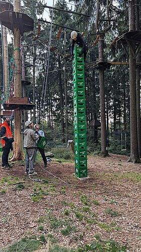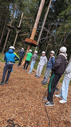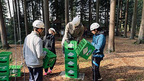 Grenzen überwinden und Gruppendynamik stärken - das Motto vom Kennenlerntag der 1AHIT am 29.9. im Hochseilgarten in Kirchschlag. Die gruppendynamischen Übungen - einen Turm zu bauen und einem Partner blind zu vertrauen - absolvierte die Klasse in zwei Gruppen. Danach konnten sich die Schüler bei einer Pizza stärken. Anschließend war die Einführung ins Sicherungssystem für den Hochseilgarten. Daraufhin durften sich die Schüler im Hochseilgarten bei den verschiedenen Parcours bewähren.