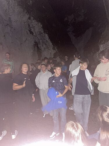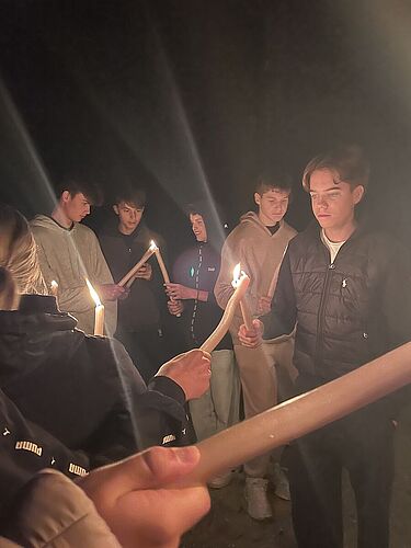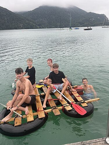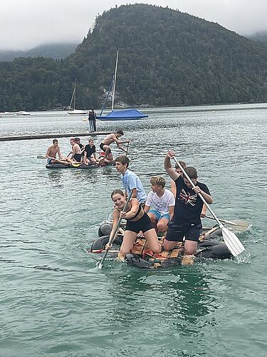 Mit den Öffis ging es nach St. Gilgen am Wolfgangsee – und schon startete unser Abenteuer. Gleich am ersten Tag hieß es: Floß bauen! Abends wurde es spannend: ein Spaziergang ganz ohne Licht, bei dem Handys natürlich tabu waren, und ein Besuch in einer stockfinsteren Höhle – alle Sinne auf volle Aufmerksamkeit! Danach ging es mit einer stimmungsvollen Fackelwanderung zurück zur Unterkunft.