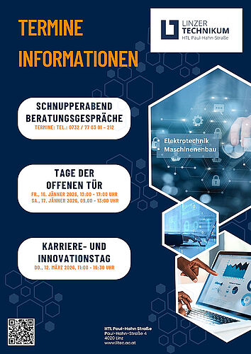 Besuchen Sie uns auch gerne an den Tagen der offenen Tür am 16. und 17. Jänner 2026 und informieren Sie sich über die vielfältigen Ausbildungsmöglichkeiten am Linzer Technikum.